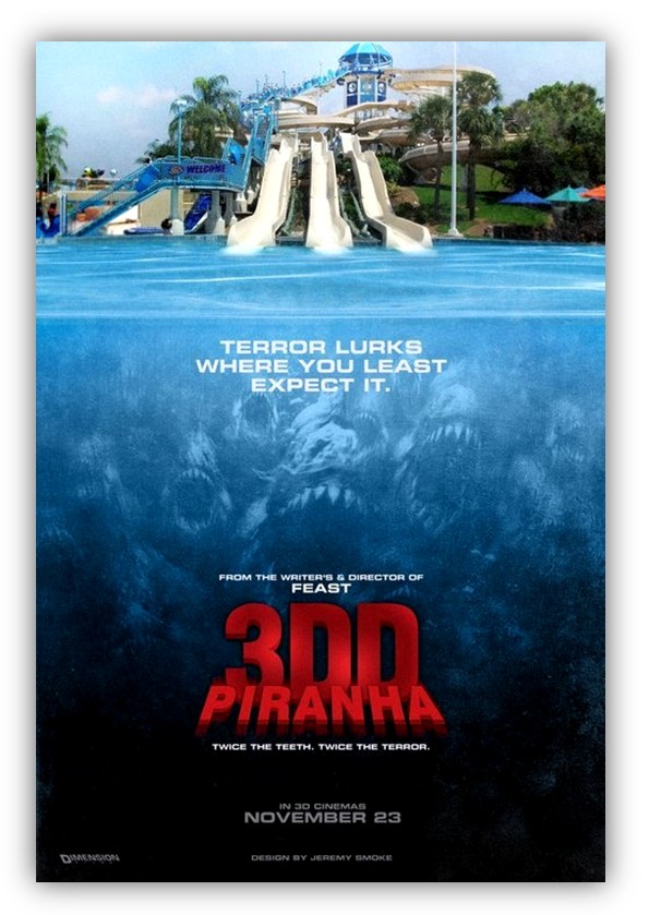 It might be a little bit better if the water slide wasn't so far away and if it didn't look like a photograph. The piranhas are clearly animated/cgi/something and the water slide is clearly resembling an ad cut out of a brochure for a water park. Cutting corners is one thing, blatant disregard for lighting is another. I'm glad that this is simply a teaser poster and I'm VERY excited for the sequel to come out, but this is just a mess in a dress. I may not have to take the movie seriously to enjoy it, but this poster is an eyesore and not exactly something I'd ever want to hang on my wall. Back to the drawing board, boys.